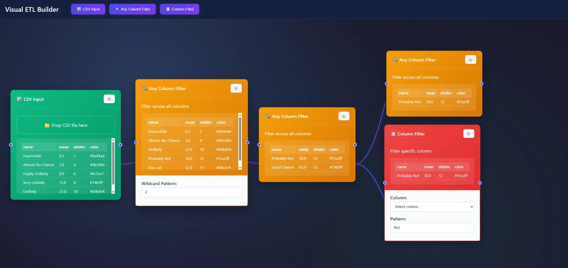 This data grid also had a wildcard filter which felt pretty exciting at the time, but I wanted the application to act more like alteryx/knime with that futuristic vibe of enso.